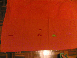 Depois a mãe aproveitou uns cortinados que já tinha, cor-de-laranja, e começou a pinta-los. Escolheu os motivos dos fulanitos na net e depois desenhou alguns no fundo dos cortinados. Aqui vão algumas fotos do antes e depois.